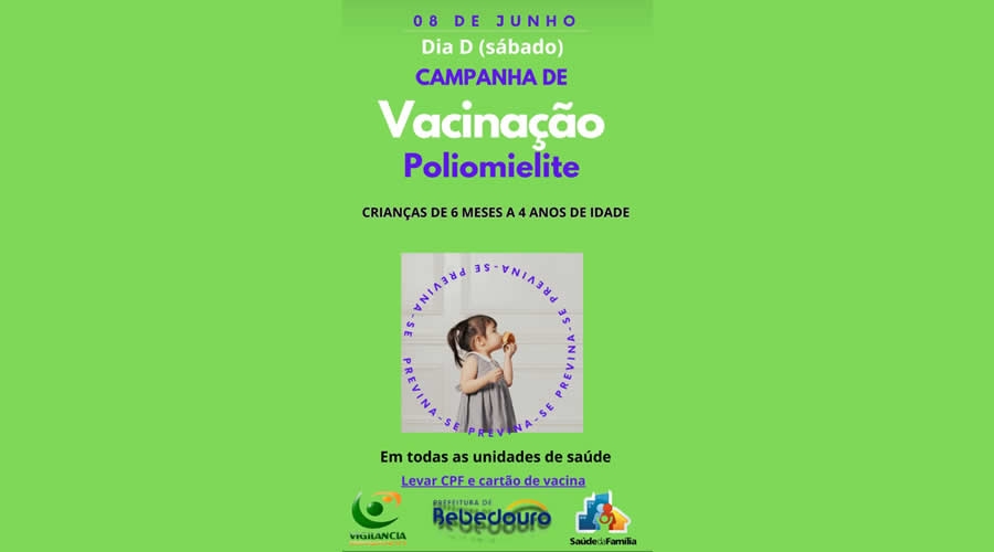 A Prefeitura de Bebedouro, através da Secretaria Municipal da Saúde (SMS), realizará o Dia D da campanha contra a poliomielite, no sábado (08/06), das 08h às 17 horas, em todas as Unidades de Saúde e no comércio.