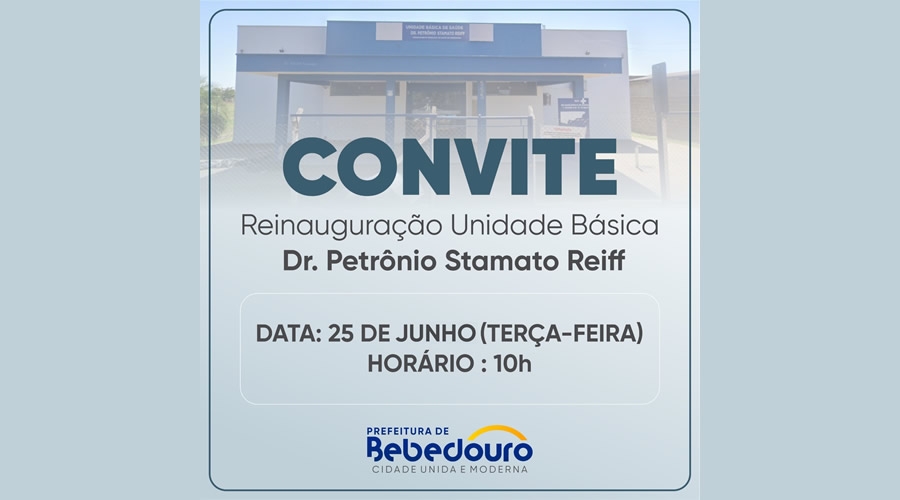 A Prefeitura de Bebedouro, através da Secretaria Municipal de Saúde (SMS), realizará na terça-feira (25/06), a reinauguração da Unidade Básica, Dr. Petrônio Stamato Reiff, localizado no setor norte da cidade.
