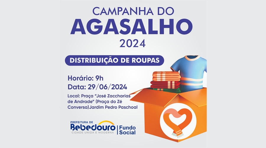 A Prefeitura de Bebedouro, através do Fundo Social, realizará a Campanha do Agasalho 2024, com a distribuição de roupas, no sábado (29/06), na Praça “José de Andrade”, localizado no bairro Pedro Paschoal.