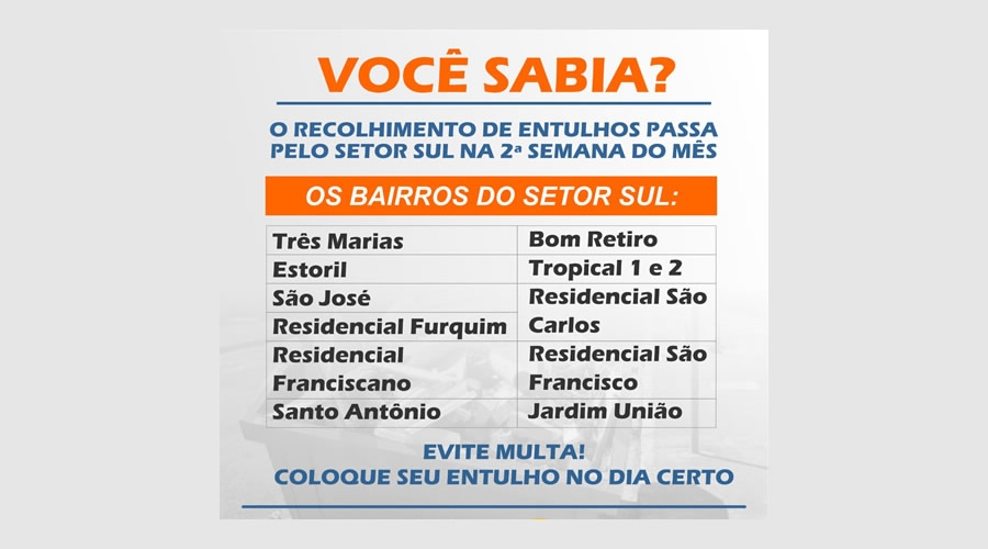 Setor sul - Três Marias, Estoril, São José, Residencial Furquim, Residencial Franciscano, Santo Antônio, Bom Retiro, Tropical 1 e 2, Residencial São Carlos, Residencial São Francisco e Jardim União.