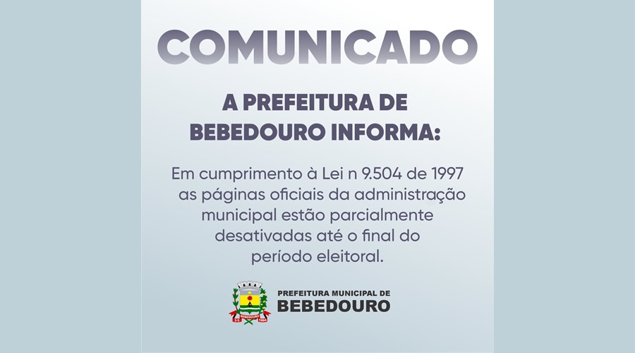A Prefeitura de Bebedouro, informa que em cumprimento à Lei nº 9.504 de 1997, as páginas oficiais do Facebook e Instagram da Administração Municipal, estão desativadas desde 05 de julho até o final do período eleitoral.