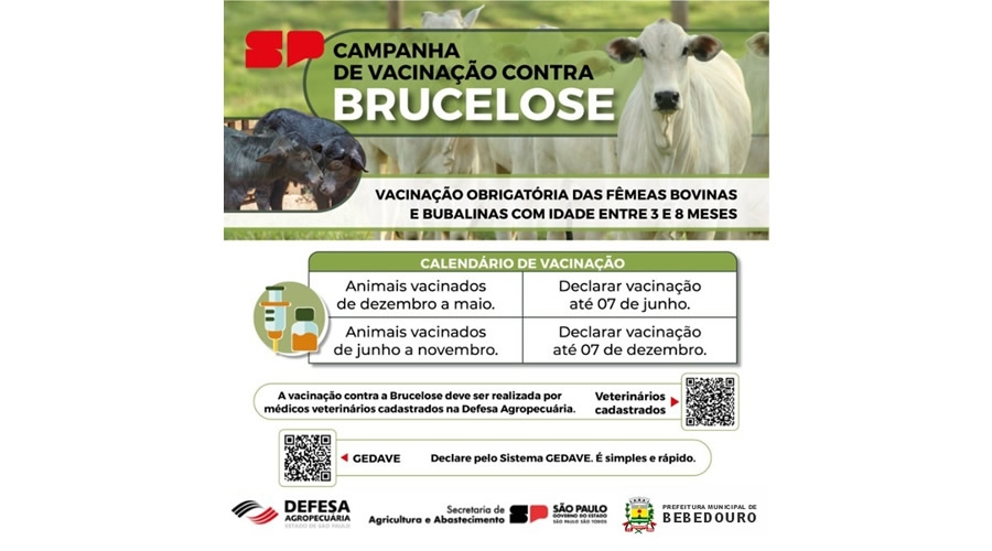 A Prefeitura de Bebedouro e a Defesa Agropecuária do Governo do Estado de São Paulo, informam que a vacina contra Brucelose vai até o dia 30 de novembro.