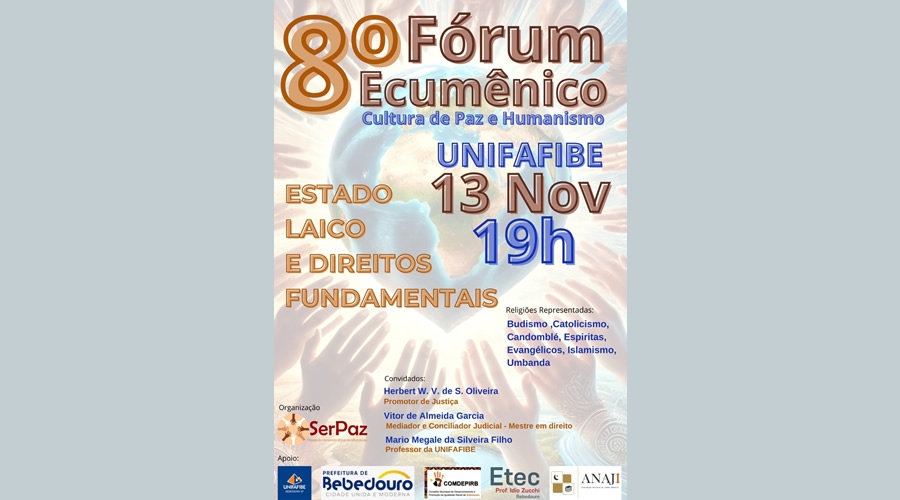A Prefeitura de Bebedouro e o Conselho Municipal de Desenvolvimento e Promoção da Igualdade Racial (COMDEPIRB), com apoio do Grupo SerPaz, realizarão no Mês da Consciência Negra, o 8º Fórum Ecumênico – Cultura de Paz e Humanismo: “Estado Laico e Direitos Fundamentais”.