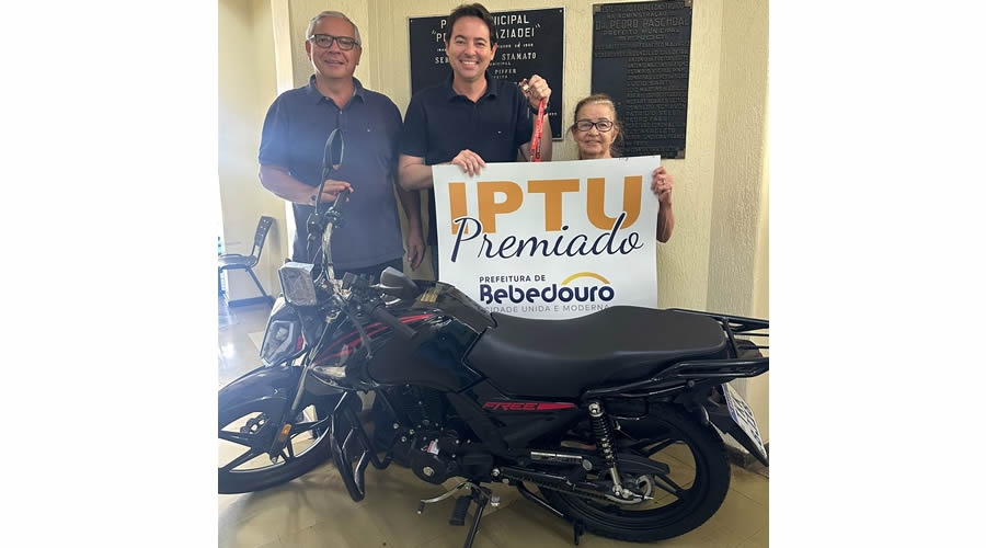 A Prefeitura de Bebedouro, por meio do Departamento de Arrecadação e Tributos, entregou uma moto 0km da campanha “IPTU Premiado 2024”. A contemplada pela Loteria Federal, foi Aparecida Angelina Fiorot de Assis, moradora do bairro Residencial Dr. Pedro Paschoal, que recebeu as chaves das mãos do prefeito municipal, Lucas Seren, na segunda-feira (18/11).