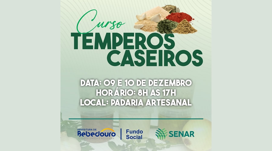 A Prefeitura de Bebedouro, através do Fundo Social, está com inscrições abertas para o curso de Temperos Caseiros, em parceria com o SENAR e Sindicato Rural. As inscrições podem ser feitas pelo WhatsApp (17) 3342-4504.