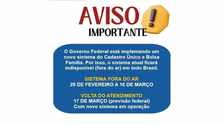 Sistema voltará ao atendimento - 17 de março (previsão federal) com novo sistema em operação.