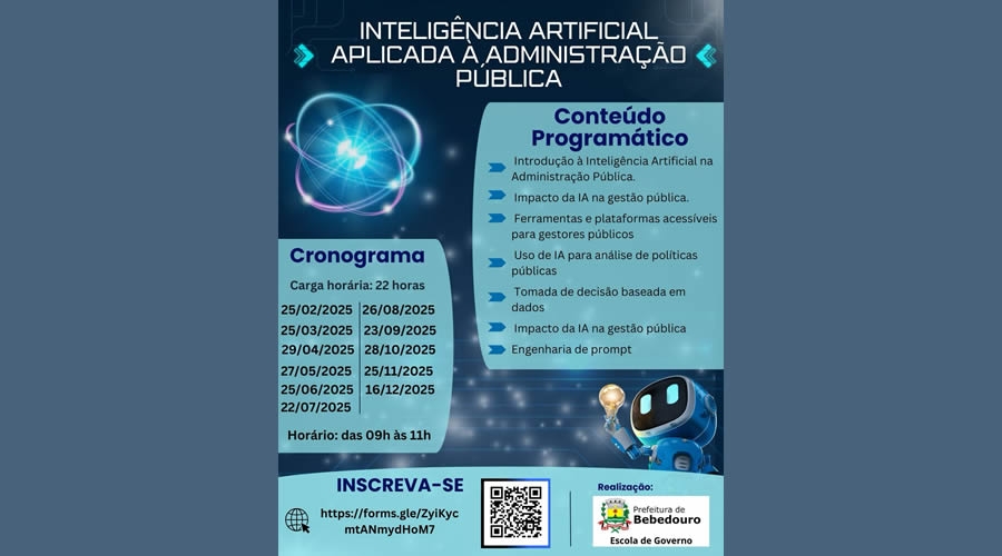 A Prefeitura de Bebedouro, por meio da Escola de Governo, promoverá um treinamento voltado para diretores e coordenadores com o tema, "Inteligência Artificial Aplicada à Administração Pública". O objetivo é capacitar os gestores para compreender e aplicar a IA como ferramenta de otimização de processos e modernização da gestão pública.