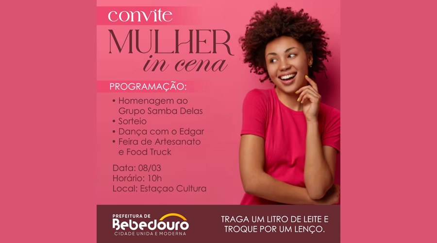 A Prefeitura de Bebedouro, através da Secretaria Municipal de Desenvolvimento Social e Cidadania, realizará no sábado (08/03), o evento MULHER IN CENA, às 10 horas, na Estação Cultura, em celebração ao Dia Internacional da Mulher.