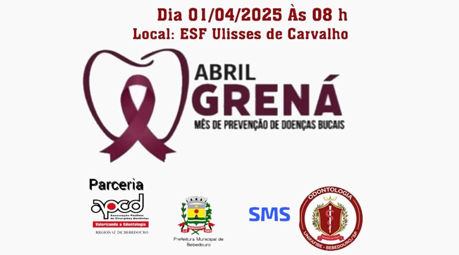 A Prefeitura de Bebedouro, por meio da Secretaria de Saúde, realizará no dia 1º de abril, a partir das 8h, o evento Abril Grená, com foco na prevenção de doenças bucais. O evento acontecerá na ESF Ulisses de Carvalho(Jardim Alvorada), e é uma parceria entre a APCD (Associação Paulista de Cirurgiões-Dentistas) e o curso de Odontologia da Unifafibe.