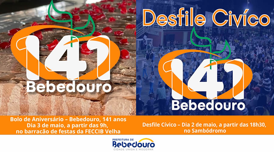 O aniversário de Bebedouro traz comemorações com início no dia 02 de maio (sexta-feira), a partir das 18h30, com o tradicional Desfile Cívico, no Sambódromo Municipal. Os Atiradores do Tiro de Guerra 02-006, e os alunos da Rede Municipal, organizados pela Secretaria Municipal de Educação de Bebedouro (SEMEB), realizarão as apresentações cívicas.