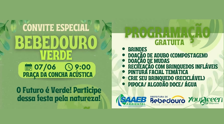 Em comemoração ao Meio Ambiente e com o objetivo de promover a conscientização ecológica, a Prefeitura de Bebedouro, por meio do SAAEB Ambiental e em parceria com a Cooperativa YouGreen, realizará no dia 07 de junho (sábado), a partir das 9h, o evento “Bebedouro Verde”, na Praça da Concha Acústica.