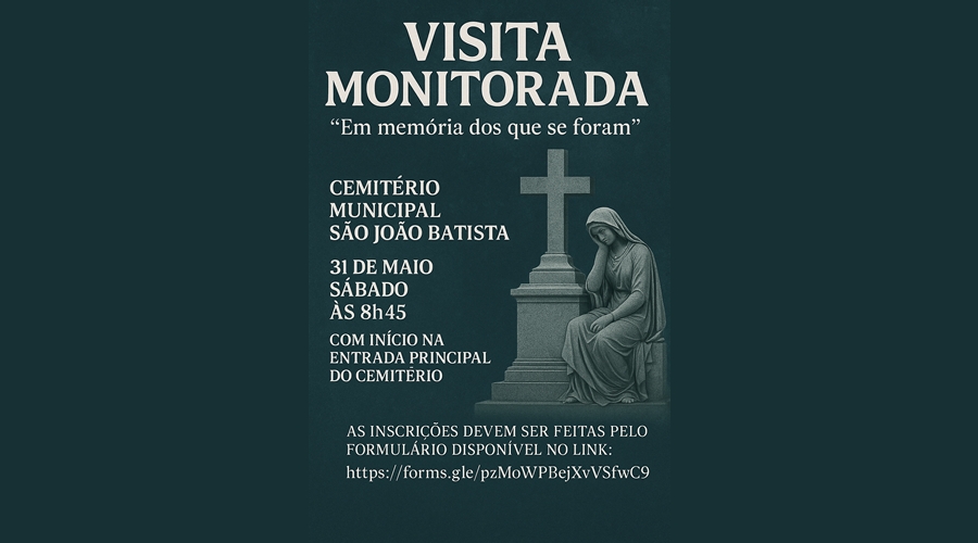 A Visita Monitorada, intitulada “Em memória dos que se foram”, será realizada no Cemitério Municipal São João Batista, no dia 31 de maio (sábado), também às 8h45, com início na entrada principal do cemitério.