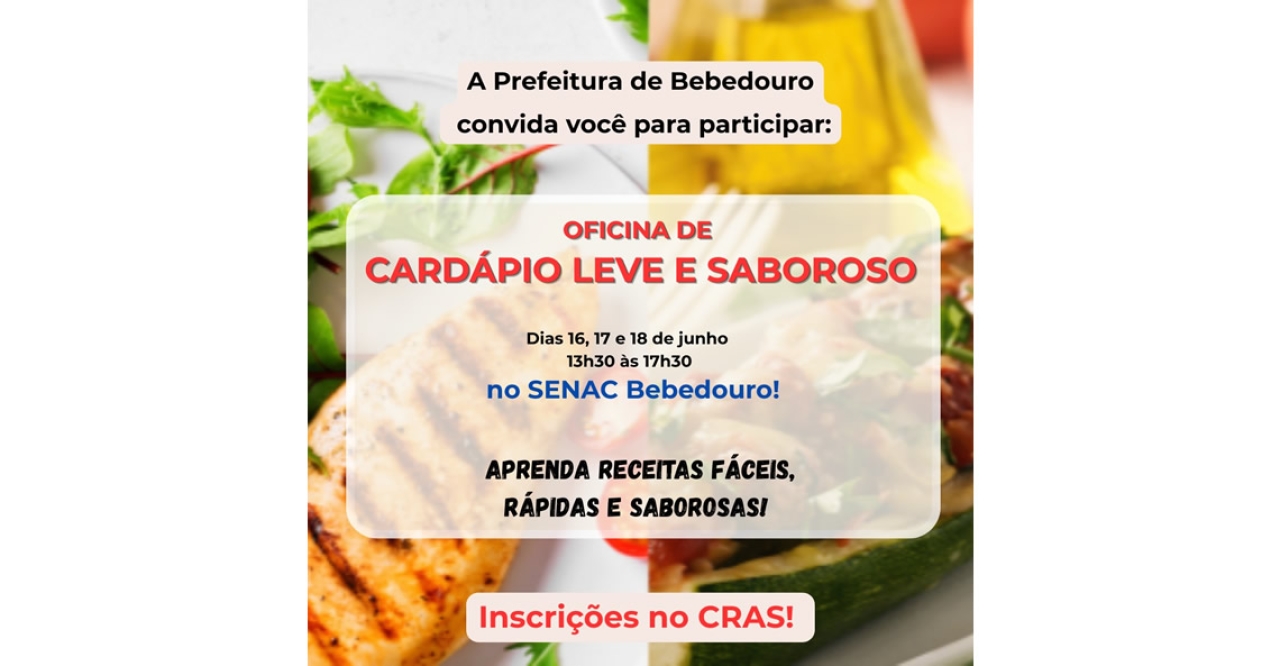 A Prefeitura de Bebedouro, por meio da Secretaria de Desenvolvimento Social e Cidadania, está com inscrições abertas para o curso “Cardápio Leve e Saboroso”, que será oferecido gratuitamente em duas turmas no mês de junho e julho, no SENAC Bebedouro. A capacitação tem como objetivo ensinar receitas práticas, saudáveis e acessíveis, promovendo alimentação equilibrada e geração de renda.