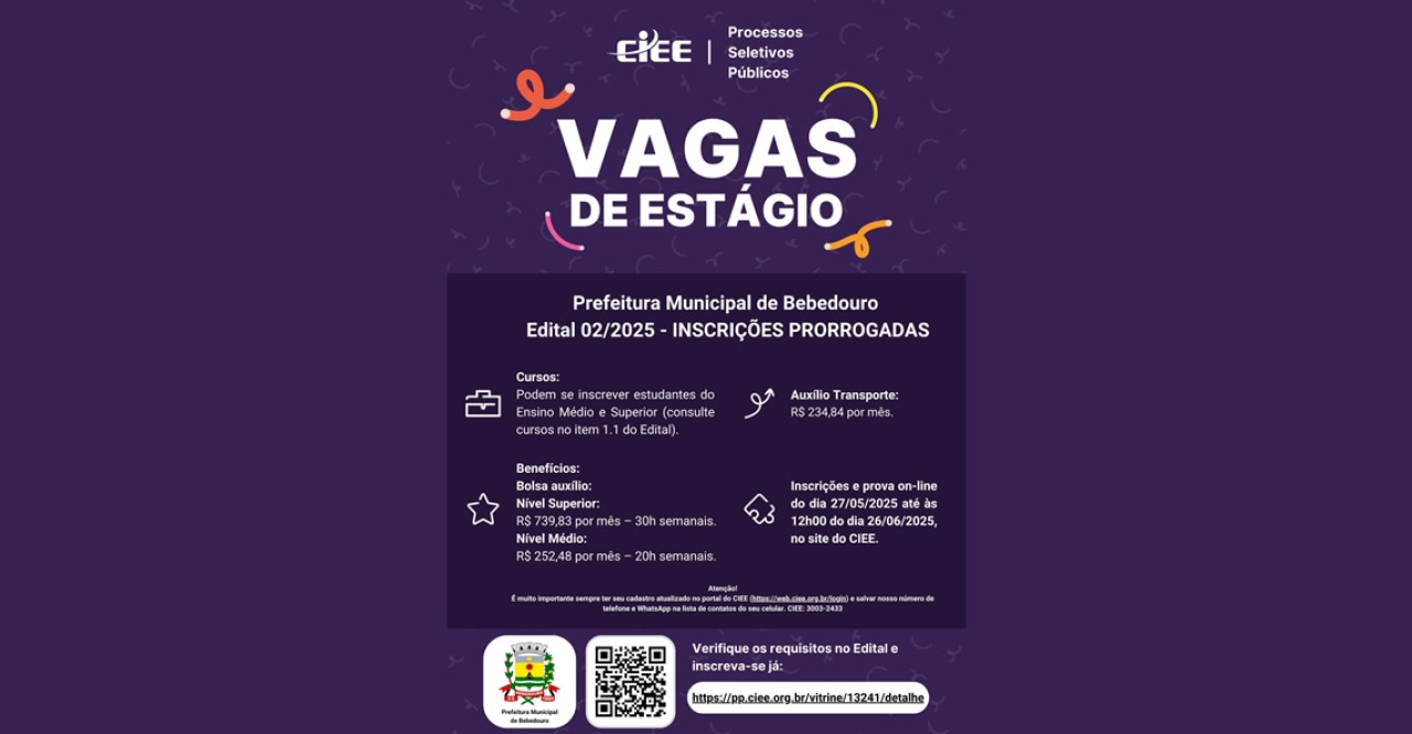 A Prefeitura Municipal de Bebedouro, em parceria com o CIEE (Centro de Integração Empresa-Escola), abriu o processo seletivo para preenchimento de vagas de estágio. Podem se inscrever estudantes regularmente matriculados no Ensino Médio e Superior.