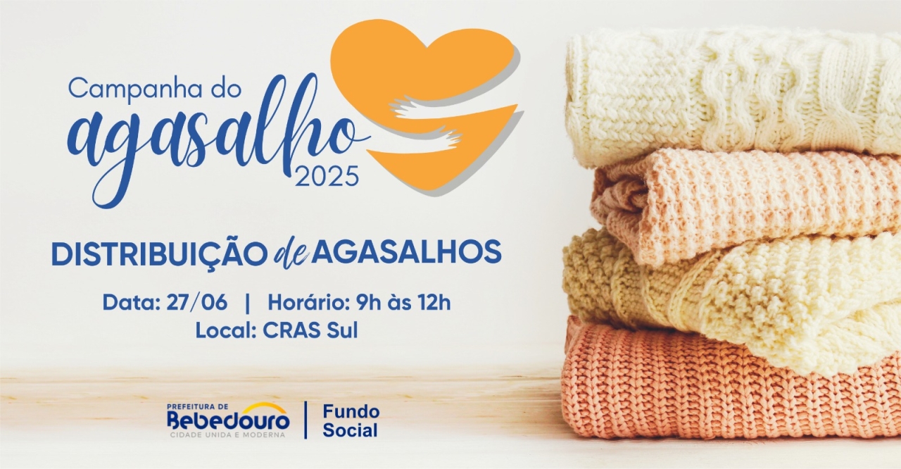 A Prefeitura de Bebedouro, através do Fundo Social de Solidariedade (FSS), está realizando a distribuição de agasalhos como parte da Campanha do Agasalho 2025, que tem como tema "Roupa boa, a gente doa".