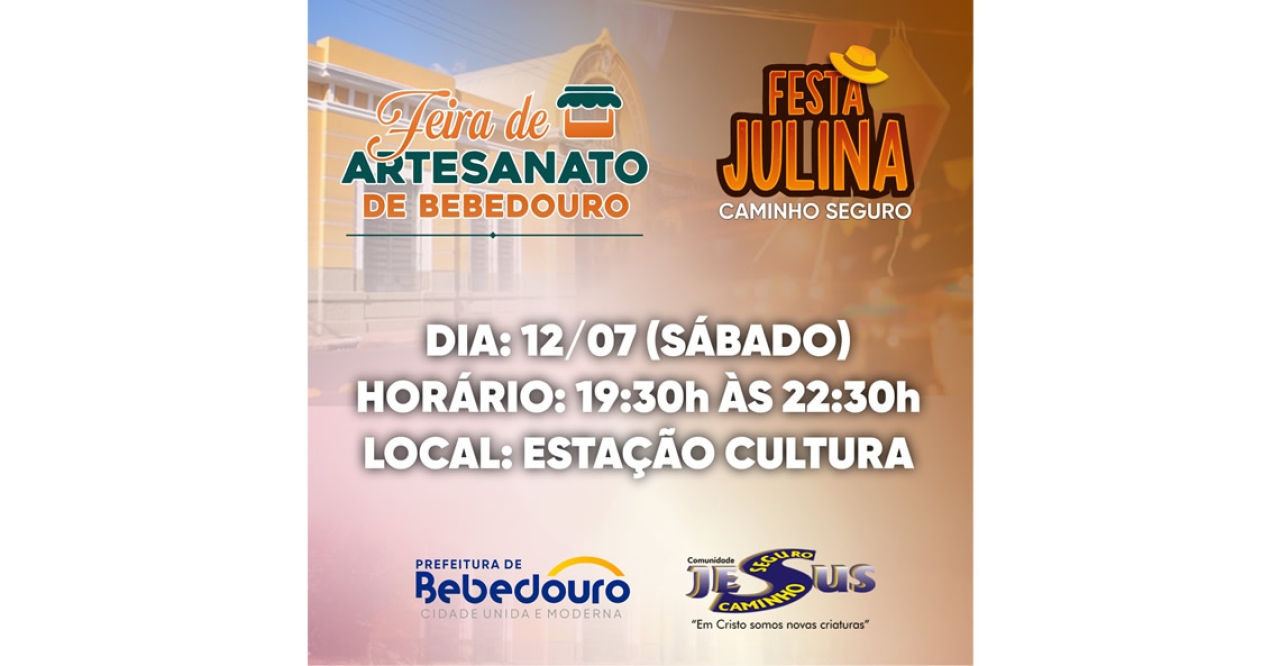 A Prefeitura de Bebedouro, através do Departamento de Turismo, realizará uma programação especial no próximo sábado, dia 12 de julho, das 19h30 às 22h30, na Estação Cultura, e será realizada em parceria com a Festa Julina da Comunidade Caminho Seguro.