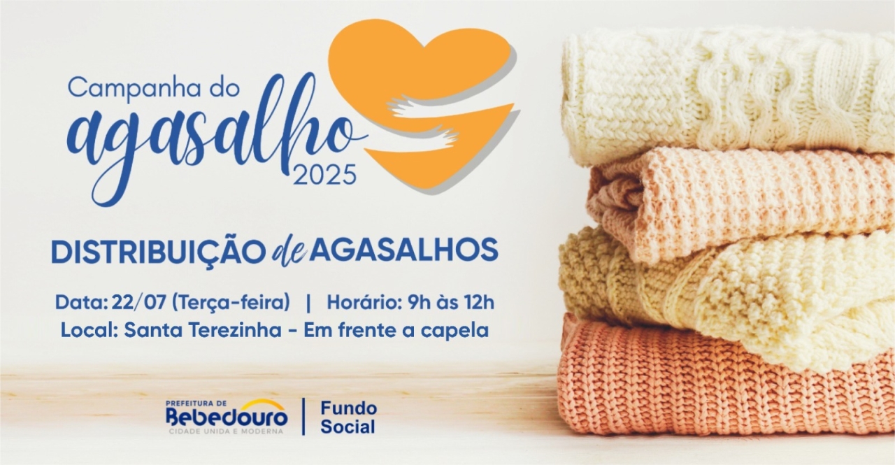 A Prefeitura de Bebedouro, por meio do Fundo Social, realizará a entrega de agasalhos e cobertores às famílias do bairro Santa Terezinha. A entrega acontecerá em frente à capela, na terça-feira (22/07), das 9 às 12 horas.