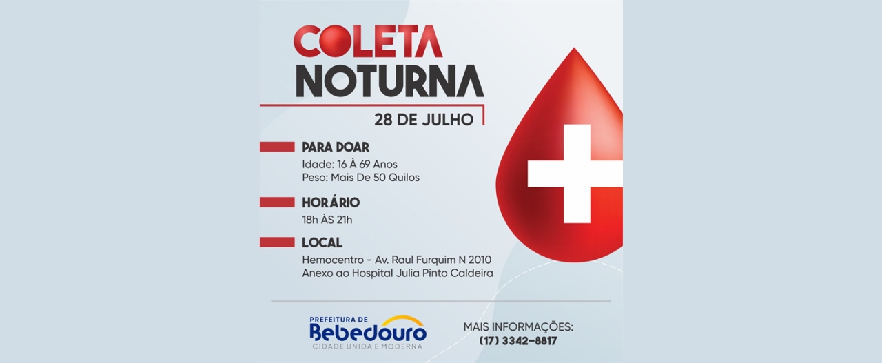 O Hemocentro de Bebedouro, realizará na segunda-feira (28/07), a coleta noturna, das 18h às 21 horas.
