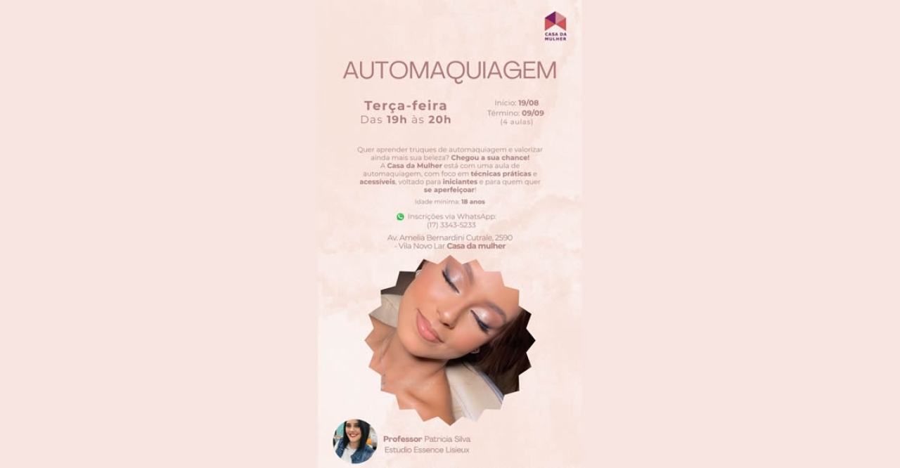 A Casa da Mulher de Bebedouro está com inscrições abertas para um novo curso de automaquiagem, voltado para iniciantes e também para quem deseja se aperfeiçoar na área. A atividade terá foco em técnicas práticas e acessíveis, promovendo o autocuidado e a valorização da autoestima.