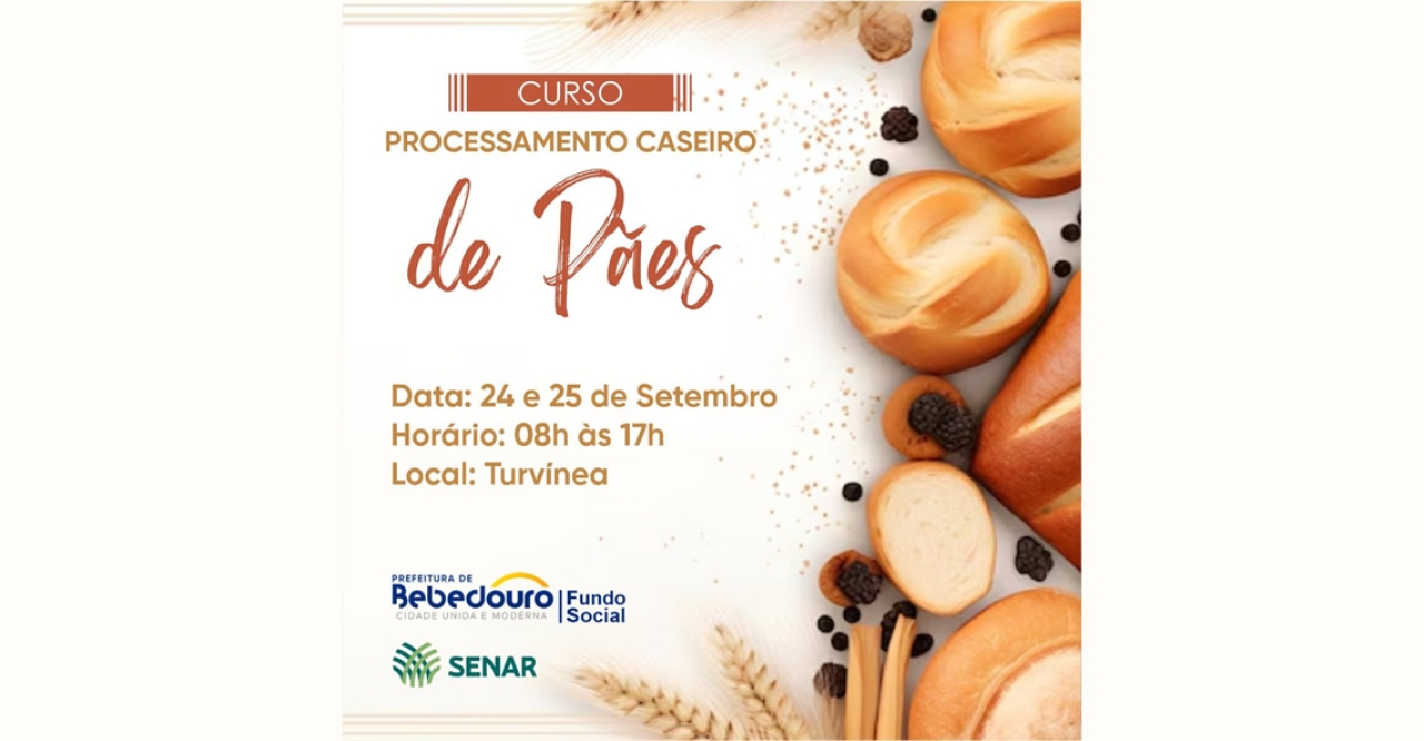 A Prefeitura de Bebedouro, por meio do Fundo Social de Solidariedade (FSS), em parceria com o SENAR e o Sindicato Rural de Bebedouro, está com inscrições abertas para o curso gratuito de “Processamento Caseiro de Pães”, que será realizado nos dias 24 e 25 de setembro, das 8h às 17h, no salão paroquial do distrito de Turvínia.