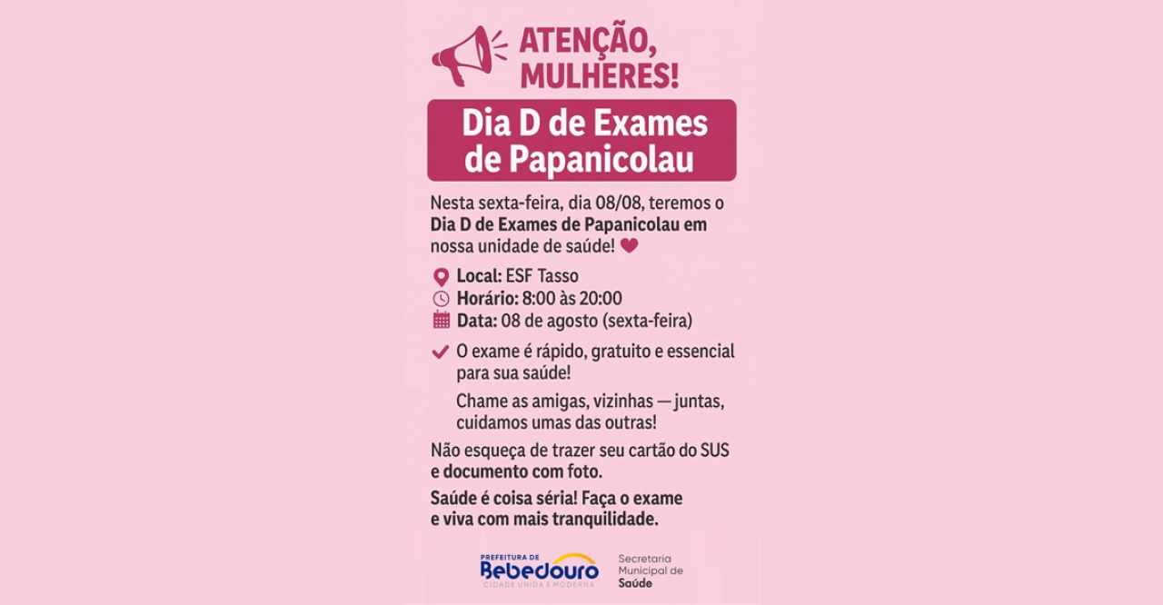 A Prefeitura de Bebedouro, através da Secretaria Municipal de Saúde (SMS), realiza nesta sexta-feira, 08 de agosto, o Dia D da Saúde na ESF Tasso Paraíso Cavalcanti, e atenderá pacientes dos bairros, Santaella e Centenário.