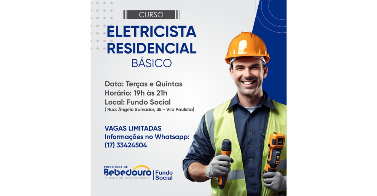 A Prefeitura de Bebedouro, por meio do Fundo Social de Solidariedade, está com inscrições abertas para o curso gratuito de Eletricista Residencial, nível básico, voltado para quem deseja aprender uma nova profissão ou se capacitar para oportunidades no mercado de trabalho.