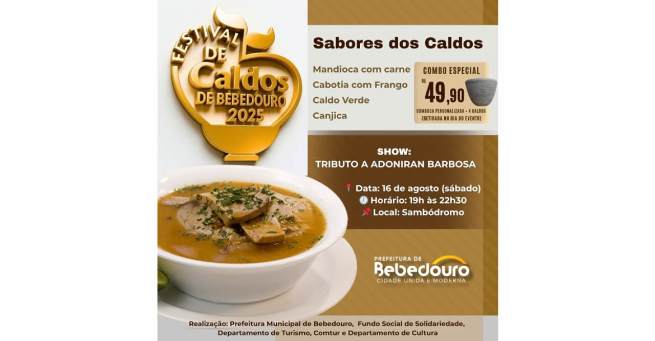 A Prefeitura de Bebedouro, através dos Departamentos de Turismo e Cultura e do Fundo Social de Solidariedade, realizará no dia 16 de agosto (sábado), das 19h às 22h30, no Sambódromo, o Festival de Caldos 2025, reunindo gastronomia, música e solidariedade em uma noite especial.