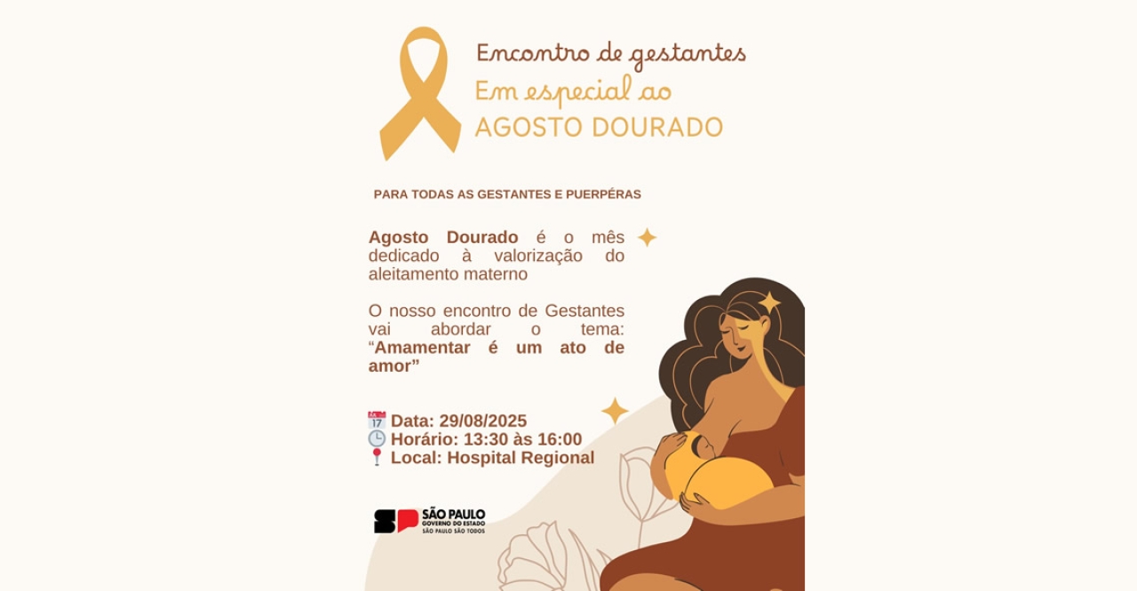 A Prefeitura de Bebedouro, através da Secretaria Municipal de Saúde (SMS), convida para o Encontro de Gestantes e Puérperas, em comemoração ao Agosto Dourado, mês dedicado à valorização e incentivo ao aleitamento materno.