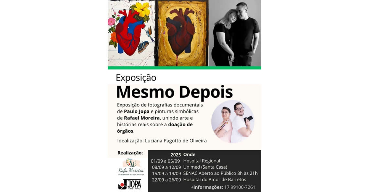 A Prefeitura de Bebedouro, em parceria com a campanha “Sou Doador, Seja Você Também!”, promove a Exposição de Arte "Mesmo Depois", com obras dos artistas Paulo Jopa e Rafael Moreira. A mostra reúne fotos e telas que retratam a importância da solidariedade e busca sensibilizar a população sobre a doação de órgãos e tecidos.