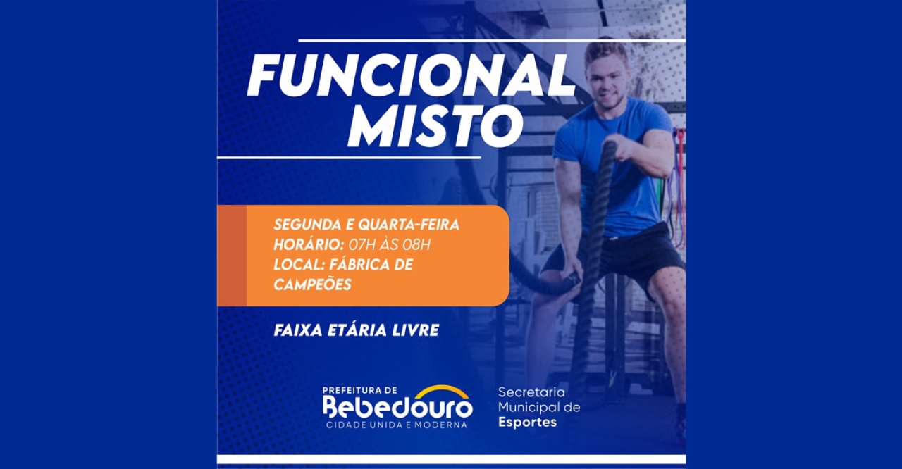 A Prefeitura de Bebedouro, por meio da Secretaria Municipal de Esportes (SME), realiza aulas de Funcional Misto, uma atividade física que combina diferentes exercícios para melhorar força, resistência, equilíbrio e condicionamento.