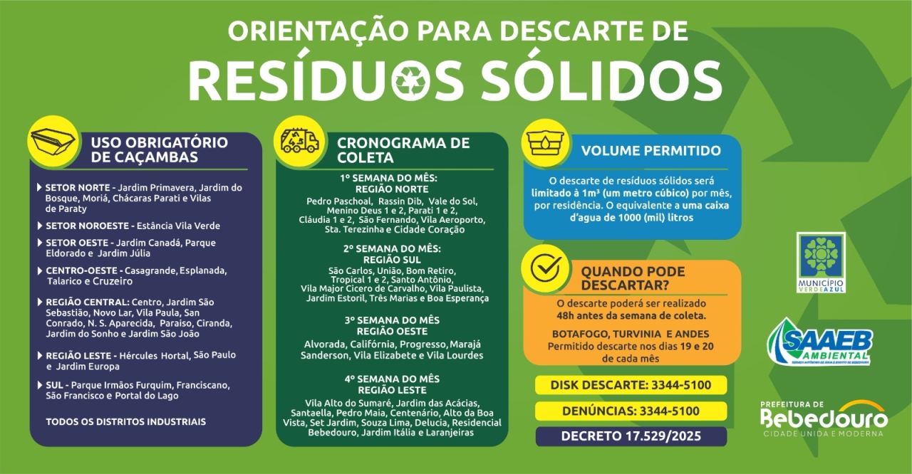 A Prefeitura de Bebedouro, através do Departamento de Meio Ambiente, estabeleceu novas diretrizes para o descarte adequado de resíduos sólidos e entulhos na cidade, com o objetivo de preservar o Meio Ambiente, garantir a limpeza urbana e organizar o serviço de coleta em setores distintos.