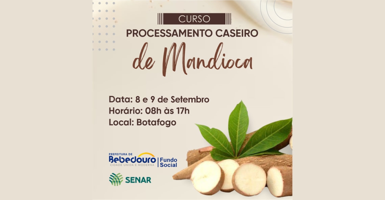 O Fundo Social de Solidariedade (FSS), em parceria com o SENAR/Sindicato Rural de Bebedouro, está com inscrições abertas para o curso de Processamento Artesanal de Mandioca no distrito de Botafogo, através do WhatsApp (17) 3342-4504. As vagas são limitadas.