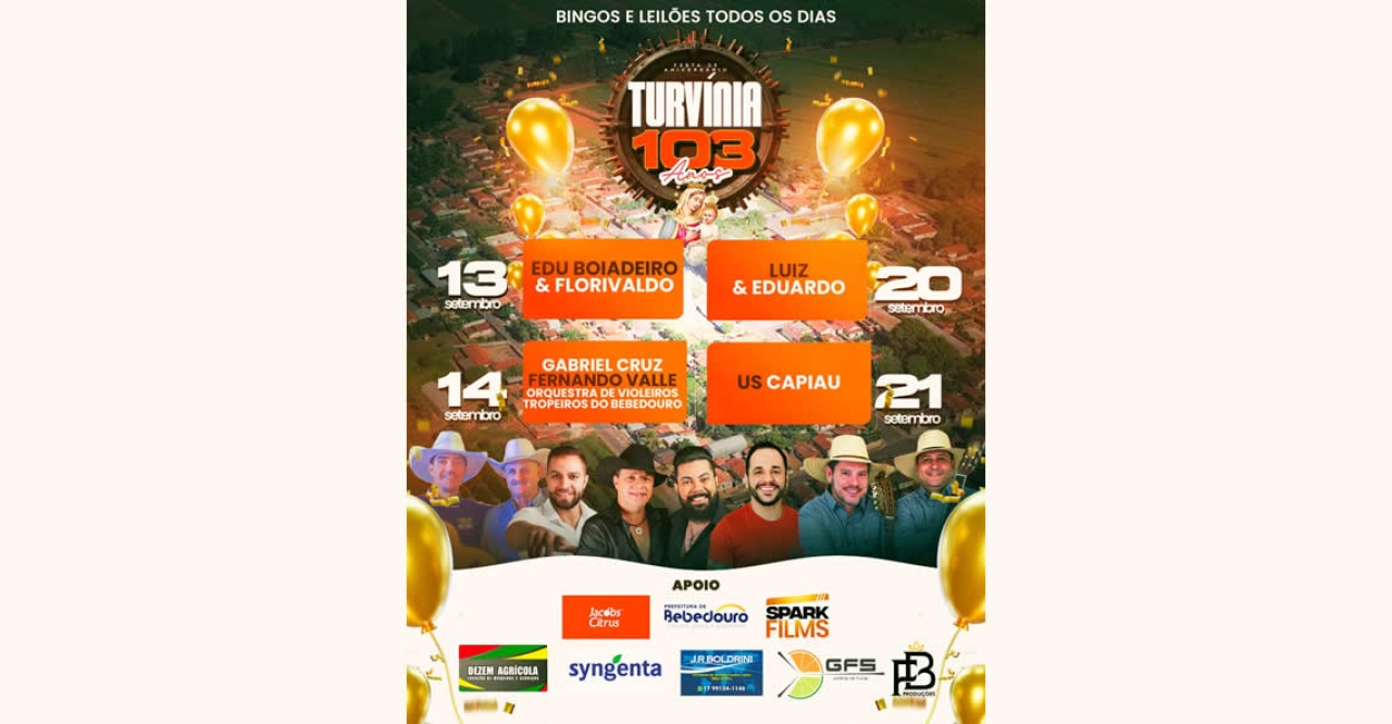 A tradicional festa de aniversário de Turvínea chega à sua 103ª edição e conta com muita música, diversão e cultura para toda a comunidade. Além de bingos e leilões, a programação musical está cheia de talentos.