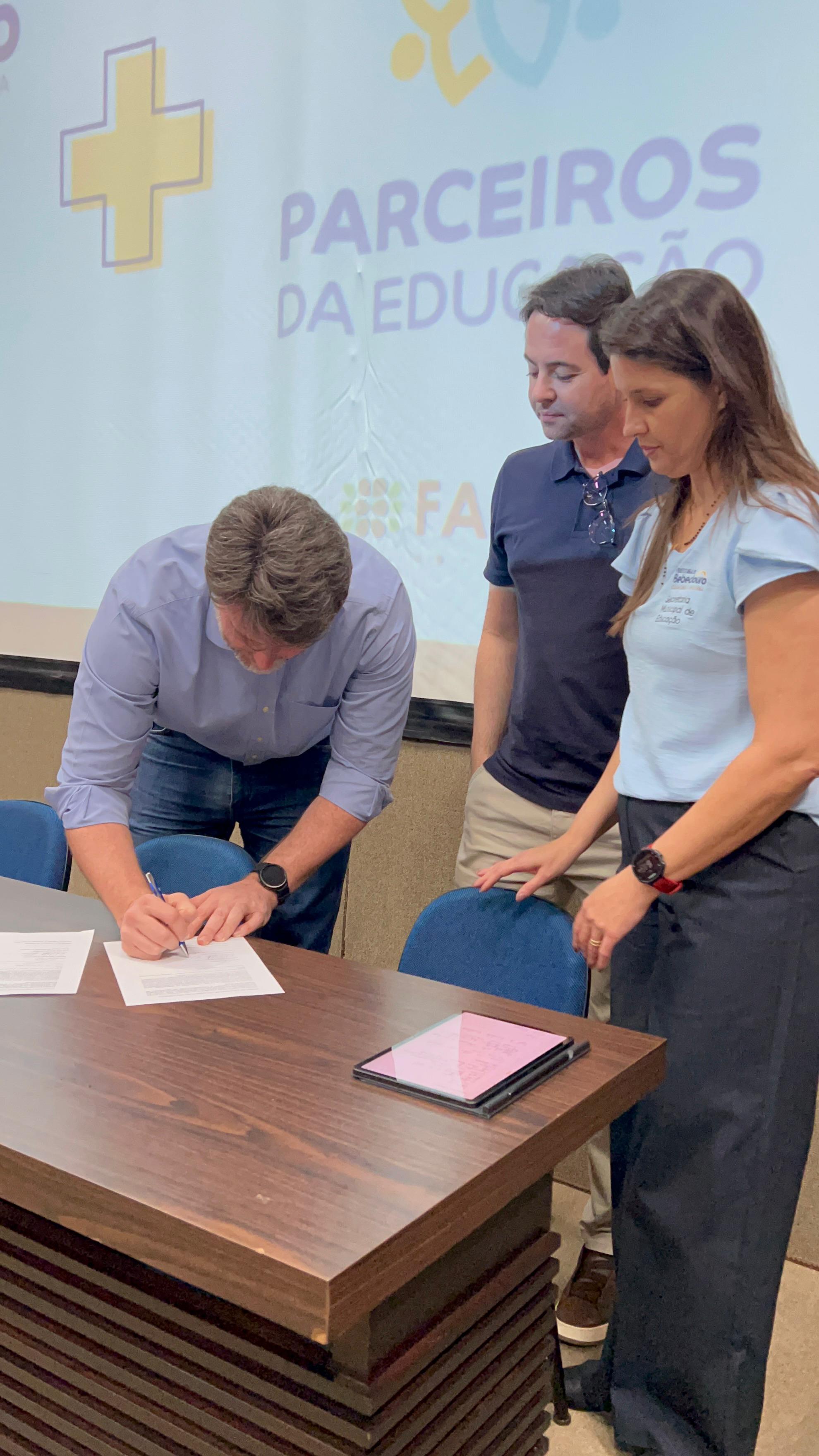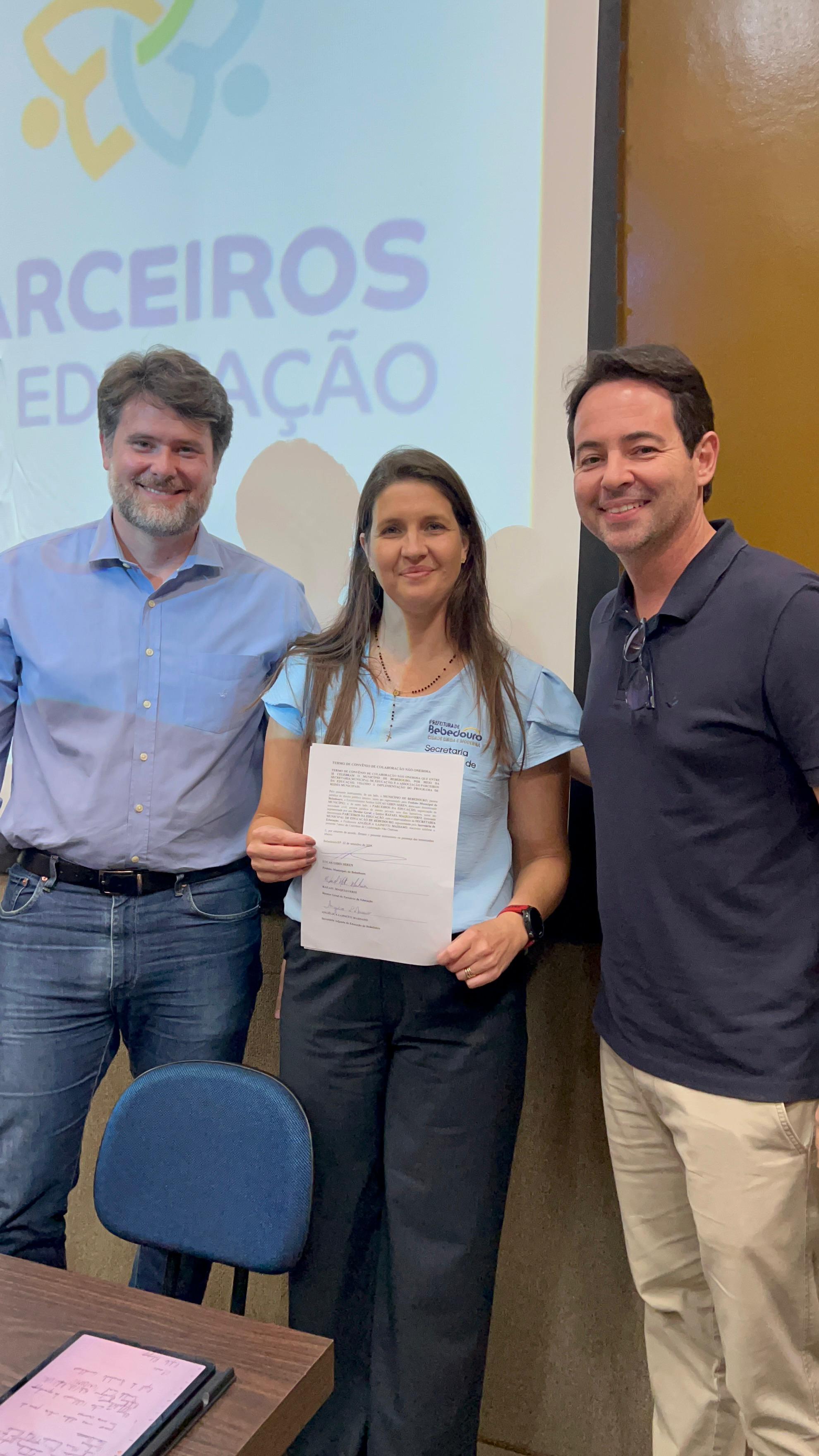 Na sequência, foi formalizada a assinatura do convênio entre o prefeito Lucas Seren, o diretor geral da Parceiros da Educação, Rafael Maquiaverni, e a secretária adjunta de Educação, professora Angélica Lainetti Massaro. A parceria fortalece a rede municipal de ensino e integra Bebedouro a um projeto que já impacta mais de 700 escolas e 400 mil alunos em todo o Estado de São Paulo.