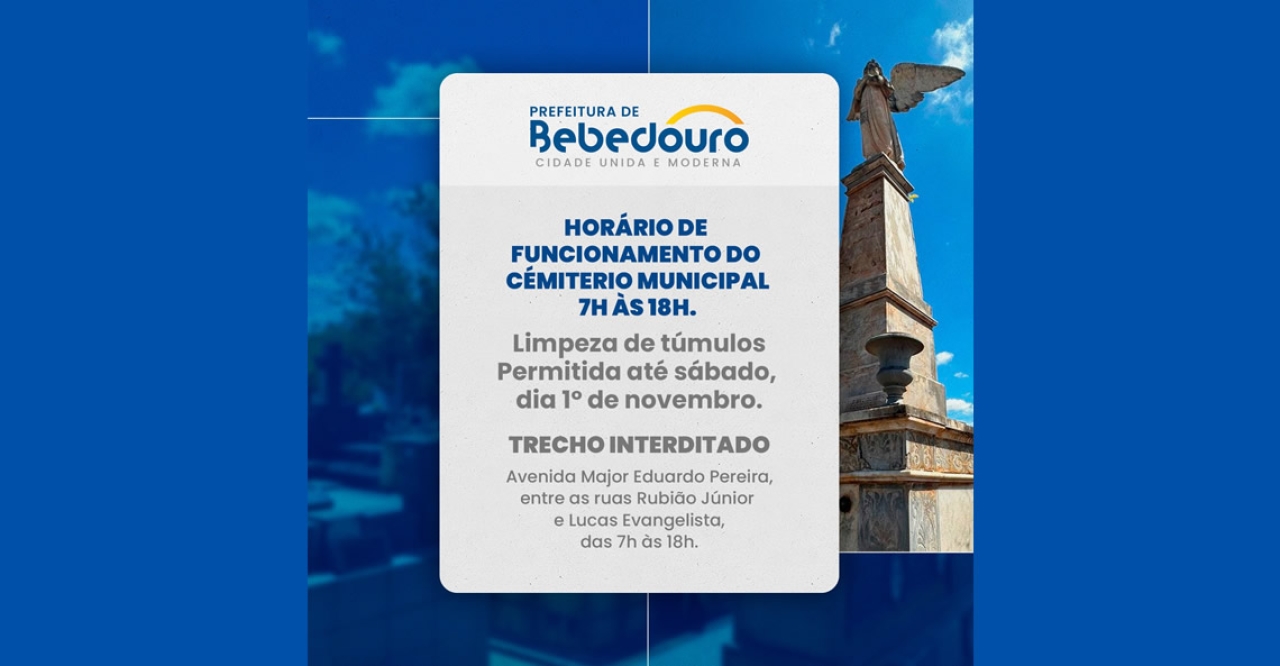 A Prefeitura de Bebedouro, através da Secretaria Municipal de Administração, informa as orientações para o feriado de Finados, celebrado no dia 02 de novembro, no Cemitério Municipal São João Batista.