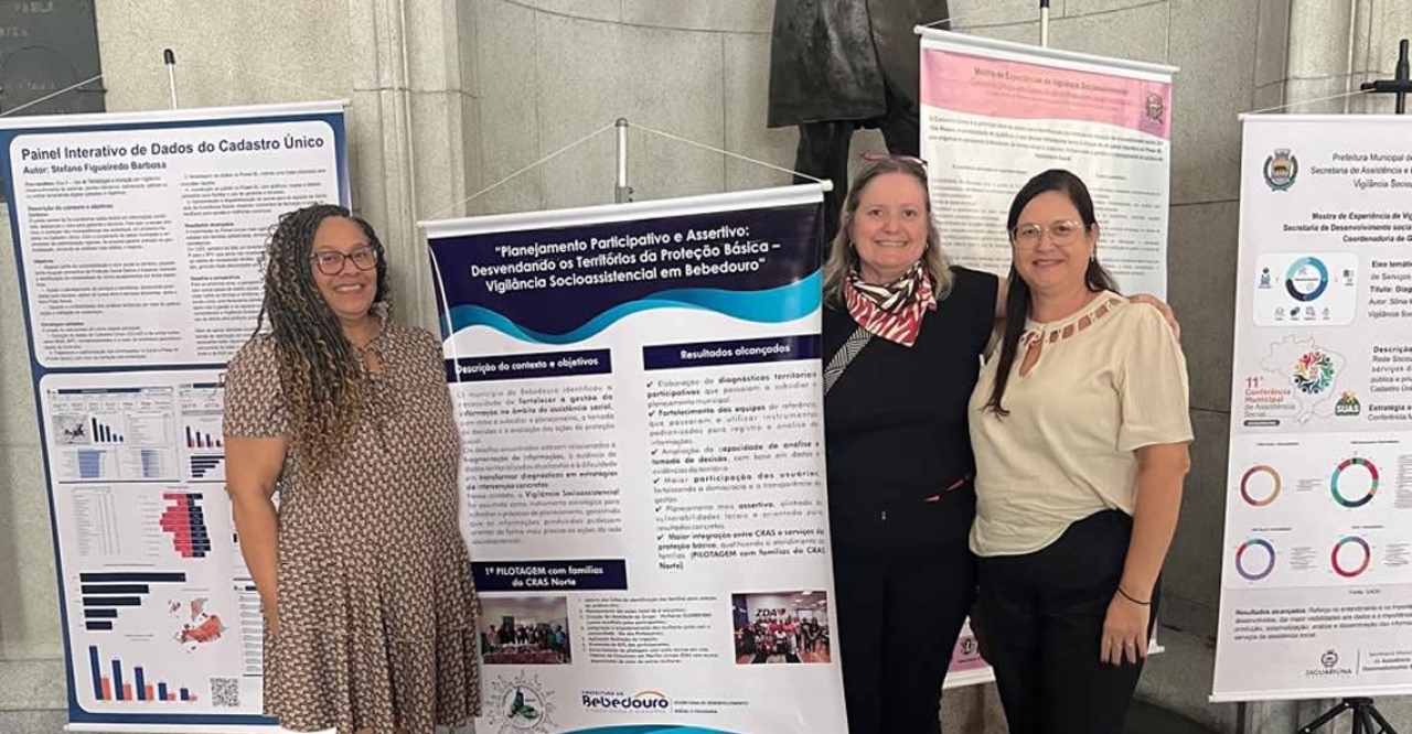 O município foi representado pela Técnica da Vigilância Socioassistencial, Elaine Marangueti, e pela Coordenadora do CRAS Norte, Lucinéia Ferreira Simião, que apresentaram o painel intitulado: “Planejamento Participativo e Assertivo: Desvendando os Territórios da Proteção Básica – Vigilância Socioassistencial em Bebedouro”. A experiência apresentada corresponde à pilotagem realizada no ano de 2024, com supervisão da empresa Projeta Social e orientação da assistente social Maria Estela Monteiro, junto às famílias atendidas no CRAS Norte.