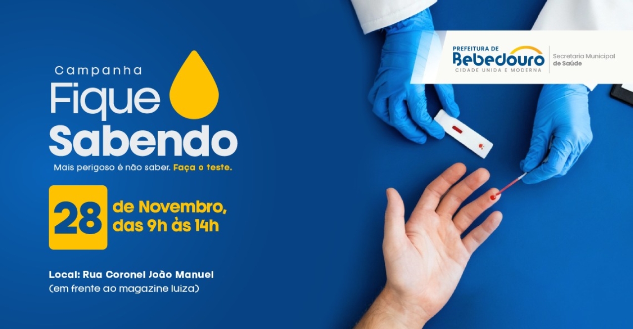 A Prefeitura de Bebedouro, através da Secretaria Municipal de Saúde (SMS), realiza na sexta-feira, 28 de novembro, a Campanha “Fique Sabendo”, ação voltada para a testagem rápida de Infecções Sexualmente Transmissíveis (ISTs).