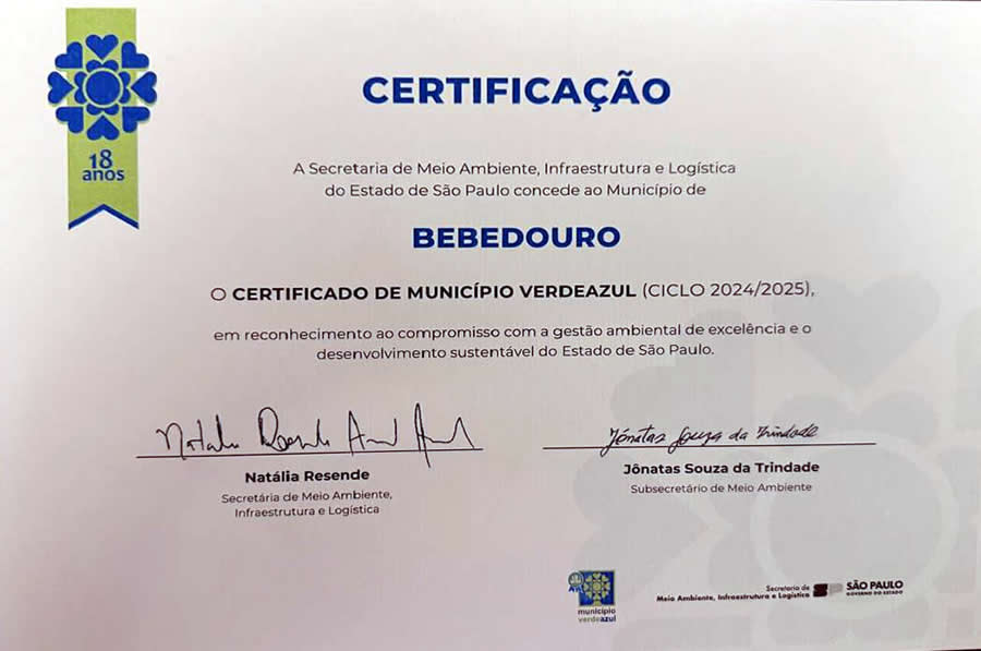 A Prefeitura de Bebedouro, através do Departamento de Meio Ambiente, recebeu em São Paulo, no Palácio dos Bandeirantes, o Selo Município Verde e Azul, importante reconhecimento estadual pelas ações e políticas públicas voltadas à preservação ambiental e ao desenvolvimento sustentável.