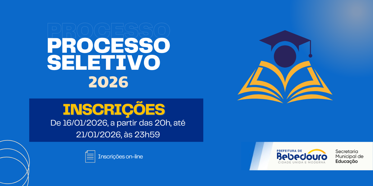 A Prefeitura de Bebedouro, através da Secretaria Municipal de Educação, abre as inscrições para o Processo Seletivo Simplificado Nº 001/2026 destinado à formação de cadastro de reserva para contratação temporária e de urgência, em regime rotativo, de professores substitutos e professores eventuais, que será realizado única e exclusivamente pela análise curricular e de títulos, conforme as disposições do edital.