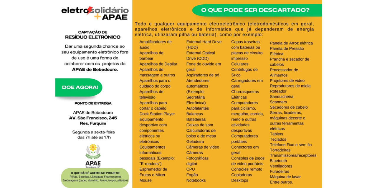A APAE de Bebedouro, por meio do projeto EletroSolidário + APAE, realiza a captação de resíduos eletrônicos com o objetivo de dar uma segunda chance a equipamentos fora de uso e, ao mesmo tempo, colaborar com os projetos desenvolvidos pela entidade.