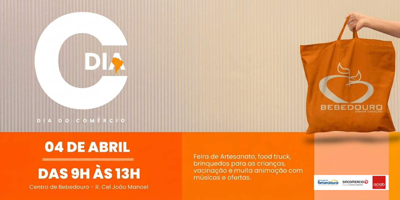 A Prefeitura de Bebedouro, por meio dos Departamentos de Cultura e Turismo e de Comércio, em parceria com a ACIAB e o Sincomércio, realizará no sábado, dia 04 de abril, mais uma edição do “Dia do Consumidor”, com programação especial em comemoração ao Dia do Comércio, das 9h às 13h, no centro da cidade, na Rua Cel. João Manoel.
