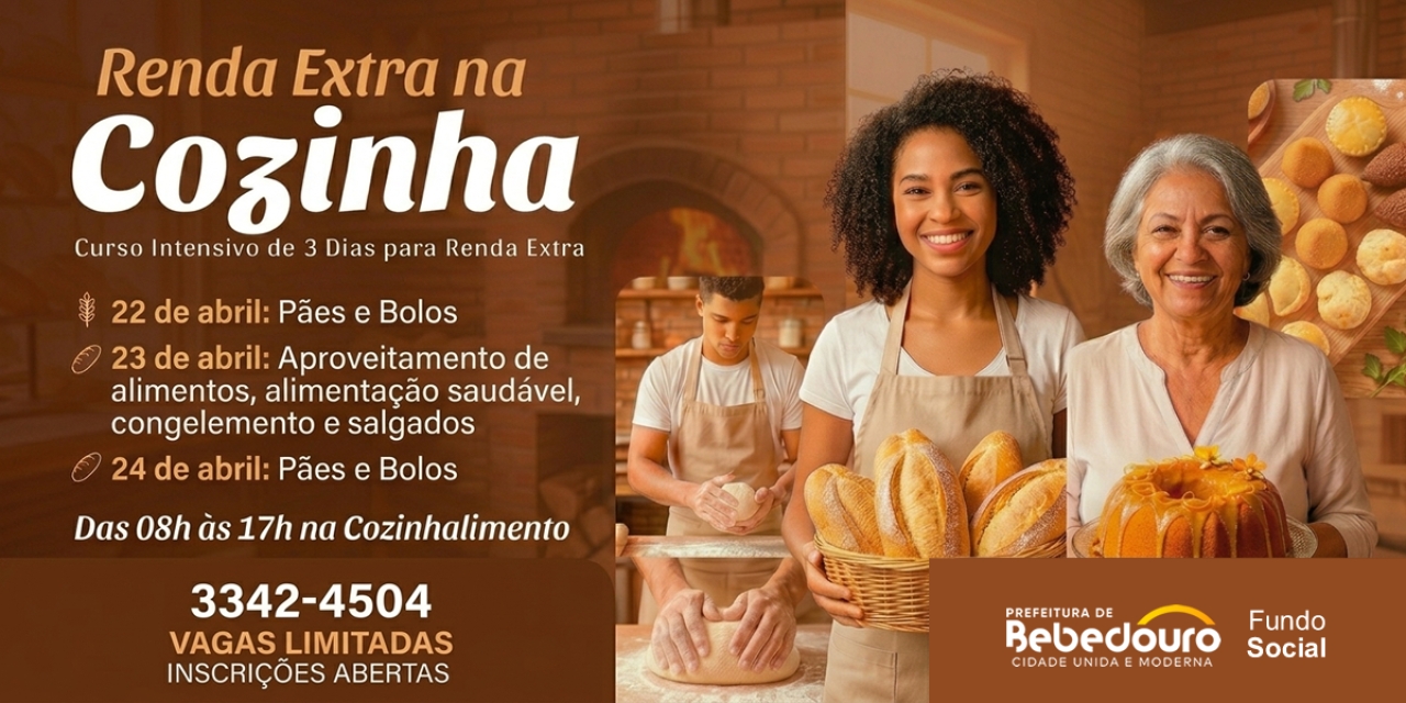 A Prefeitura de Bebedouro, através do Fundo Social de Solidariedade, realizará o curso “Renda Extra na Cozinha”, uma oportunidade para quem deseja aprender novas habilidades e gerar renda.