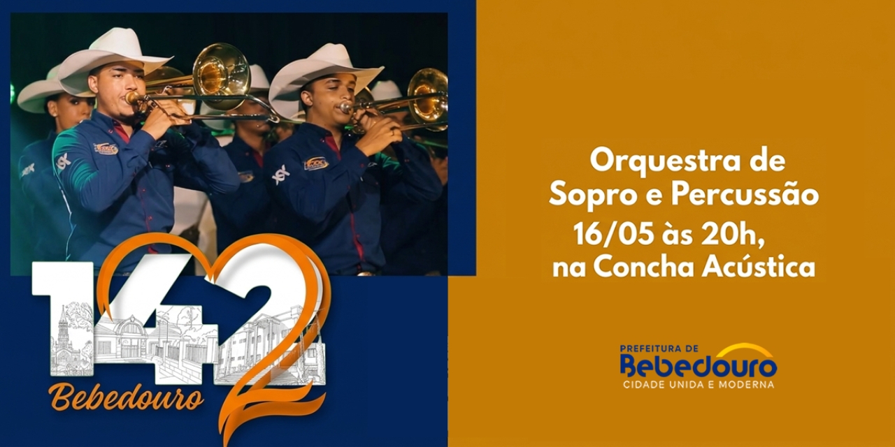 A Prefeitura de Bebedouro, por meio do Departamento de Cultura, realiza no dia 16 de maio (sábado), às 20 horas, na Concha Acústica, a apresentação da Orquestra FACMOL (Orquestra de Sopro e Percussão), como parte da programação especial em comemoração aos 142 anos.