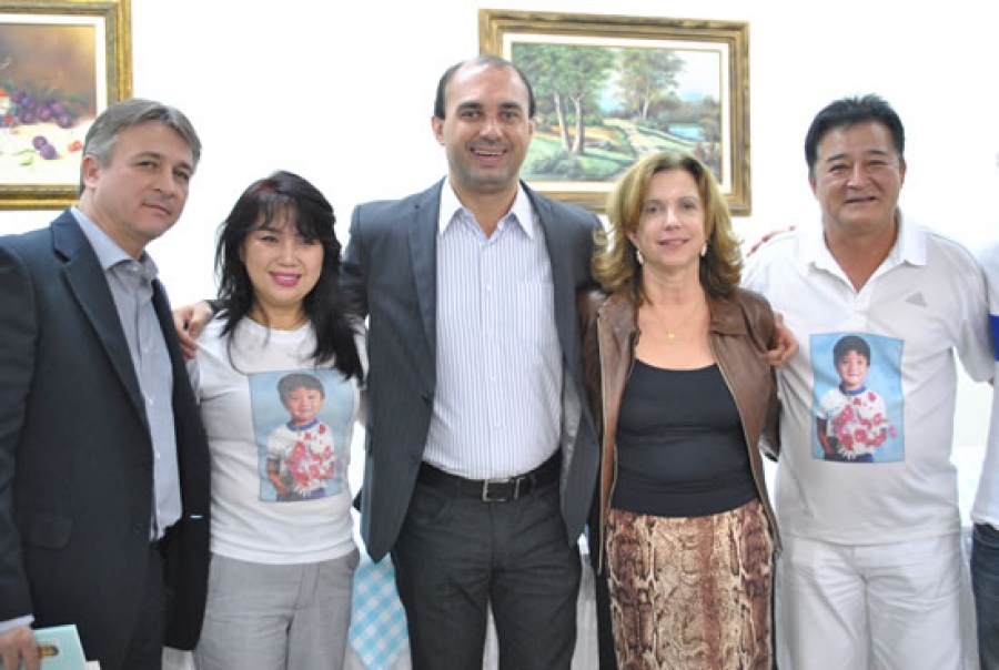 Na foto, o prefeito, Fernando Galvão e o vice, Romulo Camelini estão com o casal, a deputada Keiko Ota e o vereador Masataka Ota, e a coordenadora da Odontologia Municipal, Sonia Junqueira.