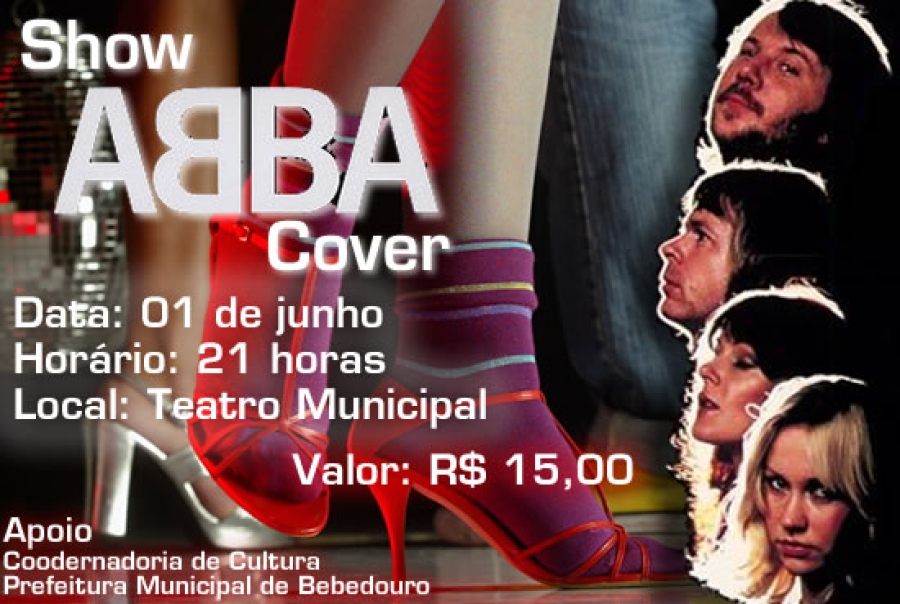 A banda cover do Abba se apresenta em Bebedouro, no sábado(01), às 21 horas, no Teatro Municipal. A banda é conhecida por sua performance, muito parecida com o grupo original. Entre um sucesso e outro da banda Abba, esta a música Dancing Queen, tudo em um espetáculo imperdível. A apresentação tem o apoio da Coordenadoria de Cultura e Prefeitura de Bebedouro.